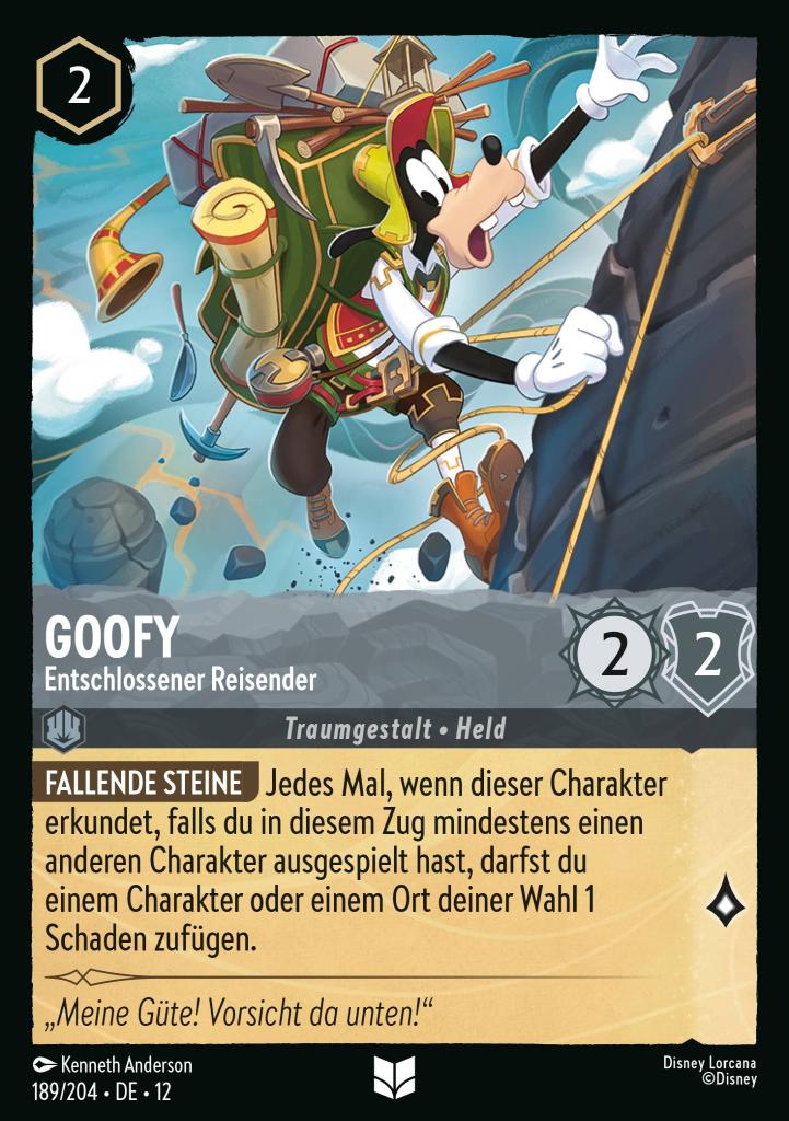 Fallende Steine Jedes Mal, wenn dieser Charakter erkundet, falls du in diesem Zug mindestens einen anderen Charakter ausgespielt hast, darfst du einem Charakter oder einem Ort deiner Wahl 1 Schaden zufügen.