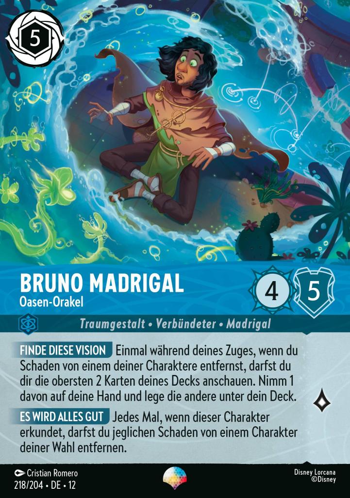 Finde diese Vision Einmal während deines Zuges, wenn du Schaden von einem deiner Charaktere entfernst, darfst du dir die obersten 2 Karten deines Decks anschauen. Nimm 1 davon auf deine Hand und lege die andere unter dein Deck.