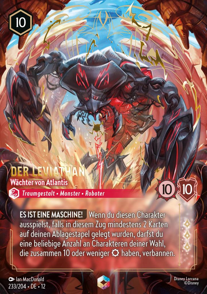 Es ist eine Maschine! Wenn du diesen Charakter ausspielst, falls in diesem Zug mindestens 2 Karten auf deinen Ablagestapel gelegt wurden, darfst du eine beliebige Anzahl an Charakteren deiner Wahl, die zusammen 10 oder weniger haben, verbannen.