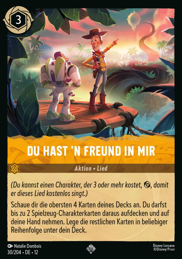 Schaue dir die obersten 4 Karten deines Decks an. Du darfst bis zu 2 Spielzeug-Charakterkarten daraus aufdecken und auf deine Hand nehmen. Lege die restlichen Karten in beliebiger Reihenfolge unter dein Deck.